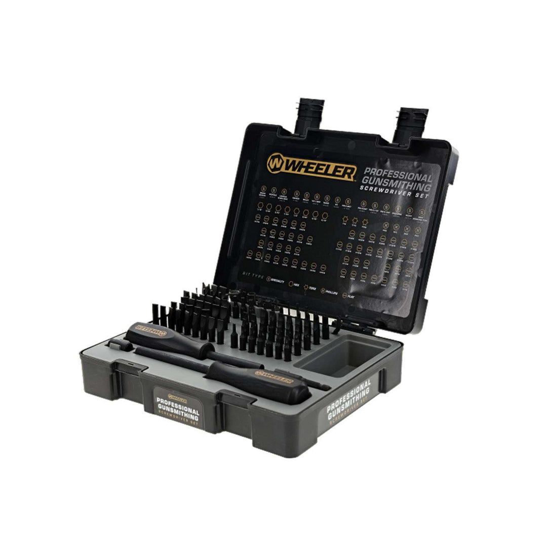 Whether you are a professional or in-home gunsmith, the Wheeler® 89 Piece Professional Gunsmithing Screwdriver Set is a must-have staple in your toolset. Unlike other screwdriver suppliers, Wheeler’s engineers measured the screws on over one hundred modern and antique firearms to ensure that we offered specialty bits for every situation. Whether you are working on a Browning® Superposed, a Remington® 700, a Smith & Wesson® revolver, or a Colt® single action, you will find that there is a bit to fit every screw on your gun. The two included drivers feature magnetized tips and rubber over-molded handles that improve ergonomics and grip while reducing hand strain. The driver shafts and bits all have a black phosphate coating that prevents rust and corrosion and extends tool life; guaranteeing that your tools will look great for years to come. All the contents are neatly organized and secured in a premium latching hard case that easily stacks on top of other Wheeler screwdriver sets for smart, convenient storage.