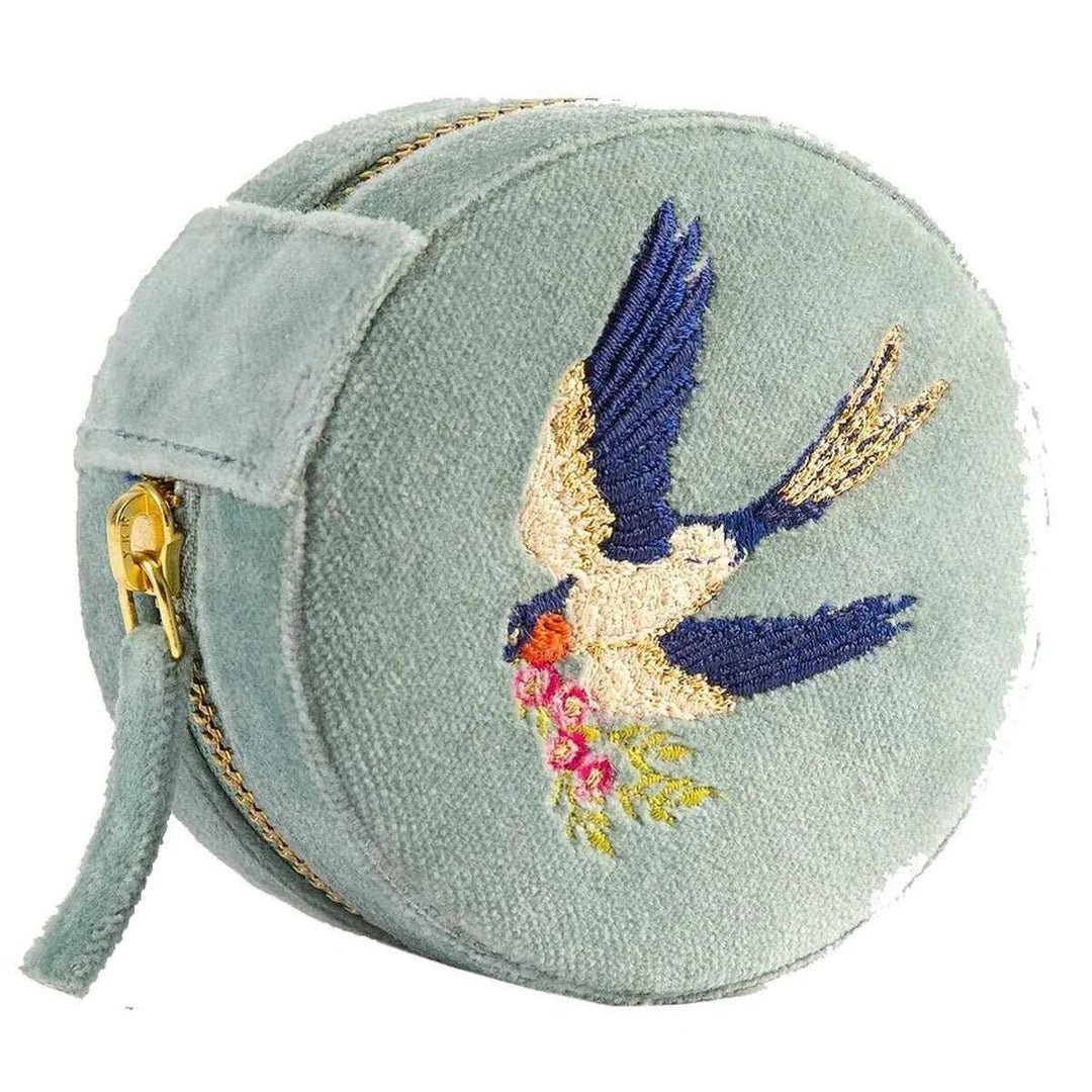 Designer Powder has brought you this women's 100% polyester velvet jewellery box using fern green tones. It measures 4.5cm(height) x 8cm(width). All the jewellery boxes come complete with powder tags. This is a stunning case that will keep your jewellery organised in the sweetest and most elegant way. Featuring a ring holder section, two separate mini trays and an elasticated band pocket for a secure hold. Perfect for travelling, for a sleepover, to the gym, or just to securely store your favourite pieces. This beautiful round design creates a great size to fit into any bag of your choice when on the go. The embroidered outside adds a cute and chic look whilst the gold zipper adds the finishing touch.
