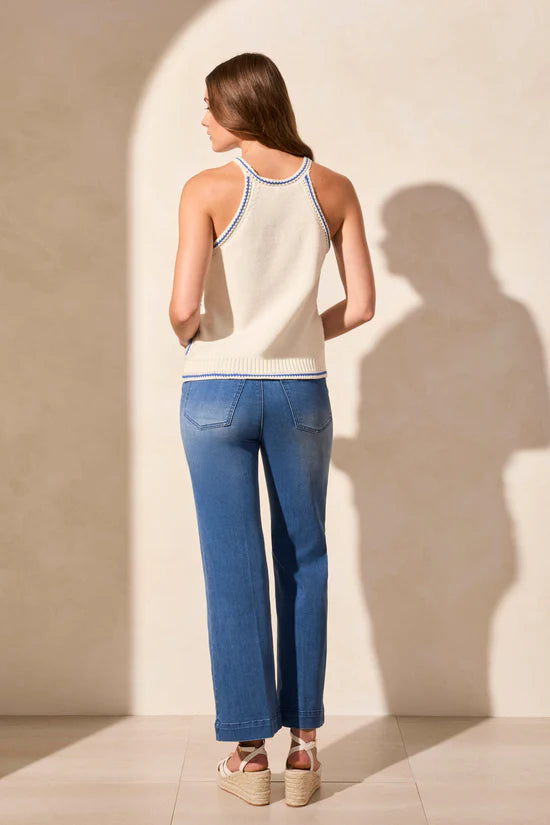 Make a statement in this halter sweater tank, exuding bohemian charm with its vibrant retro crochet design. Delight in the close fit that accentuates your curves, while the contrast ribbed finishing at the hem adds a touch of flair. Crafted from soft yet breathable combed cotton fabric, this tank ensures both comfort and style for any occasion.