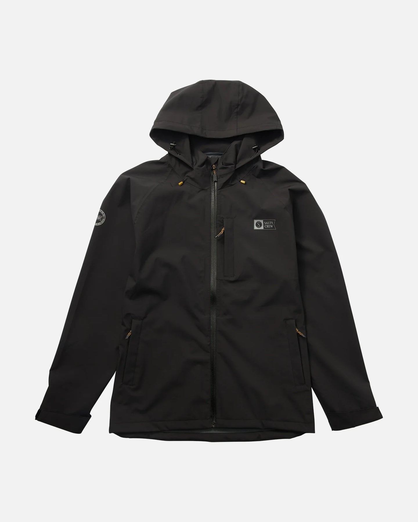 The Long Range Jacket in Black is an outerwear jacket made from mid-weight 2.5-layer material with a durable water repellent (DWR) coating. It offers 20K waterproofing and 20K breathability, with fully taped internal seams to prevent water penetration. The jacket features a waterproof front zipper, zippered chest and side pockets, and a mock neck construction with an adjustable hood and sleeve cuffs. It also includes a kill switch d-ring at the bottom hem for added safety.